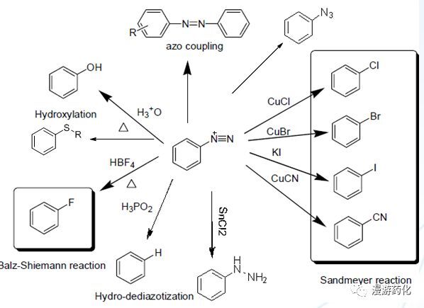 1935 年,F(xiàn).B.Dains和 F.Eberly用KI去處理重氮鹽,成功合成了碘代苯。隨后重氮化羥基取代和重氮化去胺反應也相繼被發(fā)現(xiàn),加上偶氮反應,形成了比較完善的芳香重氮化合物反應體系。