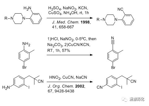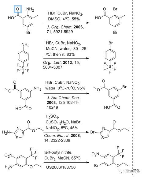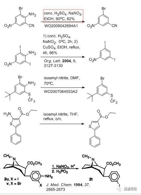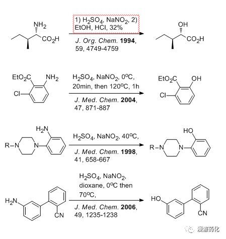 另外,該反應與變成羥基的試劑咋看很類似,區(qū)別就是前者是在硫酸的水溶液加熱發(fā)生羥基取代,后者是在濃硫酸的環(huán)境中脫除反應,或是有硫酸銅或銅粉的催化,或是在亞磷酸的還原氣氛中脫除。