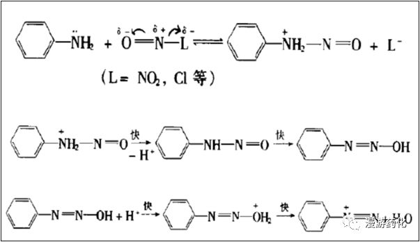 芳胺的重氮化反應需經2步,首先是親電試劑進攻芳胺氮原子生成不穩(wěn)定的中間產物,然后不穩(wěn)定中間產物迅速分解,整個反應受第一步控制。無機酸不同,參與重氮化反應的親電試劑也不同。稀硫酸中參與反應的是N2O3(一為不穩(wěn)定結構ONONO,一為穩(wěn)定結構ONNO2),鹽酸中參與反應的是亞硝酰氯NOCl;在濃硫酸中則是亞硝基正離子N+O。他們的親電性強弱順序為: N+O>NOCl>N2O3