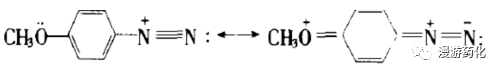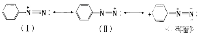 共振式(I)(II)可解釋重氮鹽有雙重反應性能, (I)式表現(xiàn)易發(fā)生放氮的取代反應,(II)式作為重氮組分進行偶合反應。