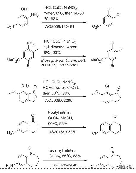 對于重氮鹽生成鹵代芳烴和腈基化合物的反應,其機理還沒有完全搞清楚,一般我們認為是一個自由基反應,苯環(huán)上的取代基(如羥基,烷氧基,酰基,羧基,硝基和鹵素等),無論是吸電子基團還是供電子基團,對反應都沒有特別的影響,氯代必須用CuCl/HCl 體系,溴代則要用CuBr/HBr 體系,碘代則一般用鹽酸做重氮鹽,不用Cu 鹽催化,直接加KI或NaI 就能得到碘苯。
