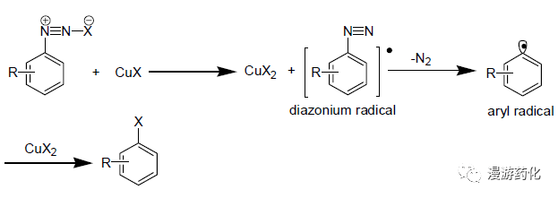 氯離子和溴離子的親核能力較弱,因此用同樣的方法很難將氯、溴引入苯環(huán)。1884年,Sandmeyer發(fā)現(xiàn)在氯化亞銅或溴化亞銅的催化下,重氮鹽在氫鹵酸溶液中加熱,重氮基可分別被氯和溴原子取代,生成芳香氯化物或溴化物,這一反應稱為Sandmeyer反應。