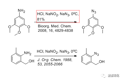 由于疊氮鈉是劇毒品,碰擊易炸,使用要小心。切忌敞口環(huán)境下與酸混合,否則生成劇毒的疊氮酸氣體。做此類反應,需要在密閉的體系中操作,其中一口用反扣的橡皮塞,最后把疊氮鈉溶于水中,用注射器推入到反應體系中。反應跟蹤時,用注射器取樣,產物大多在LCMS上不出分子離子峰。TLC板跟蹤。