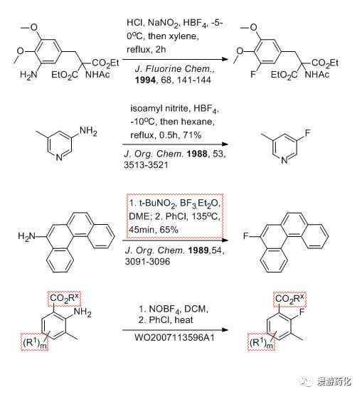 1927 年,同樣是德國的化學家G.Balz和G.Schiemann發(fā)現(xiàn)直接加熱苯胺的硼氟酸重氮鹽能得到氟苯,這就是Balz-Schiemann反應。